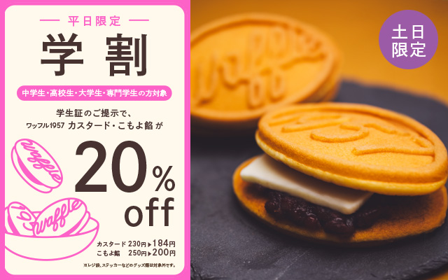 一番街店「Waffle1957」平日学割と“こもよ餡バターワッフル“発売のお知らせ。