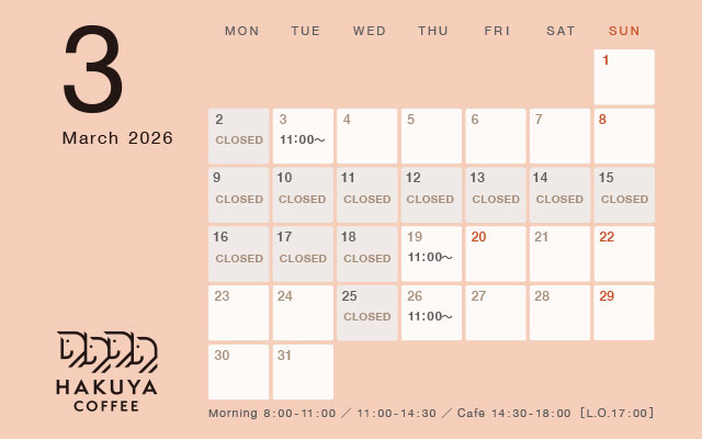 HAKUYA COFFEEはお休みをいただきます。
