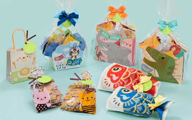 キュートなうさぎや恐竜、こいのぼりに自慢の焼菓子を詰め合わせました。今年は、表と裏で柄が違う恐竜のバスケットに楽しいサーカスのゾウさん柄が仲間入り!こいのぼりの袋の裏面は、塗り絵としてもお楽しみいただけます。こいのぼりにくまさんが乗ったフェルトのかごはお菓子を食べ終わった後も、小物入れとしてご利用頂けます。