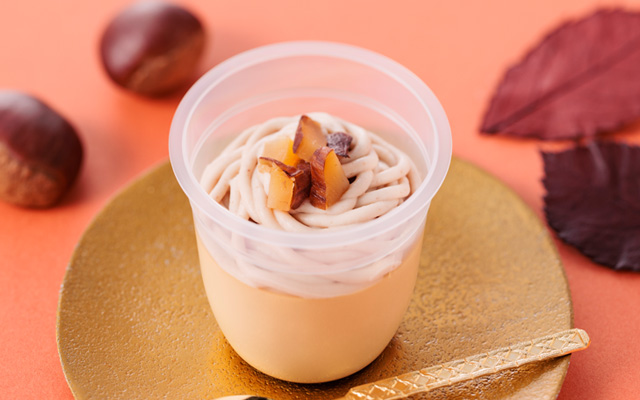 和栗を使ったマロン風味のなめらかなプリンに、マロンクリームをたっぷり絞り、渋皮栗をトッピングしました。モンブランとプリンが両方楽しめる贅沢な季節限定の栗のプリンです。