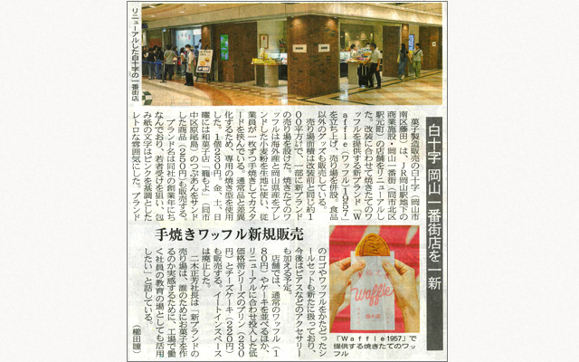 2025.08.19 8/19(火)の山陽新聞朝刊に掲載されました。 掲載情報 7/24(木)にリニューアルオープンした白十字一番街店と新ブランド「ワッフル1957」について取材された記事が8/19(火)の朝刊に掲載されました。 山陽新聞サンデジでもご覧頂けます。 ・「白十字一番街店」はこちら 岡山市北区駅元町1 TEL0862326967 白十字 OPEN 9:00-20:00 Waffle1957 OPEN10:00-19:00 洋生菓子 店舗限定 ワッフル1957(カスタード) 230 (税込) 史上最高味、 史上最ふわふわ。 洋生菓子 店舗限定 ワッフル1957(籠もよ餡) 250 (税込) あなたと会えたなら、 それは幸せな週末です。
