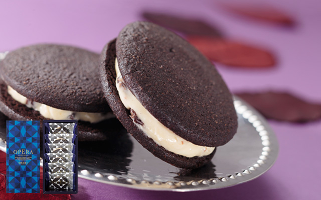 ほろ苦いブラックココアのクッキーにレーズンとホワイトチョコクリームをサンドした『オペラレーズンサンド』。大人のミステリアスな知的な興奮を感じるミュージカル“オペラ座の怪人”をイメージして作ったほんのりラム酒の香る大人のレーズンサンドです。