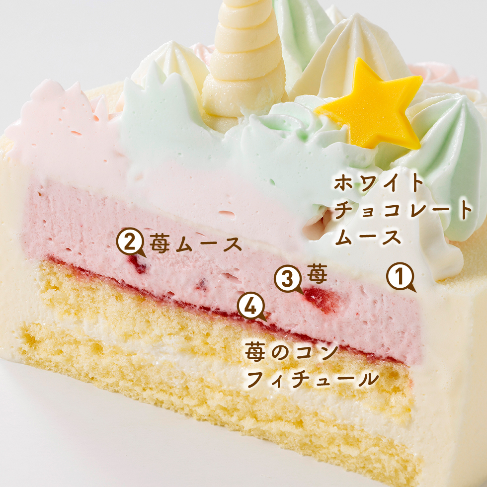 ホワイトチョコと苺ムースに苺のコンフィチュールを閉じ込めました。幸運をもたらすユニコーンは聖夜の素敵な夢を見せてくれるかも…?!