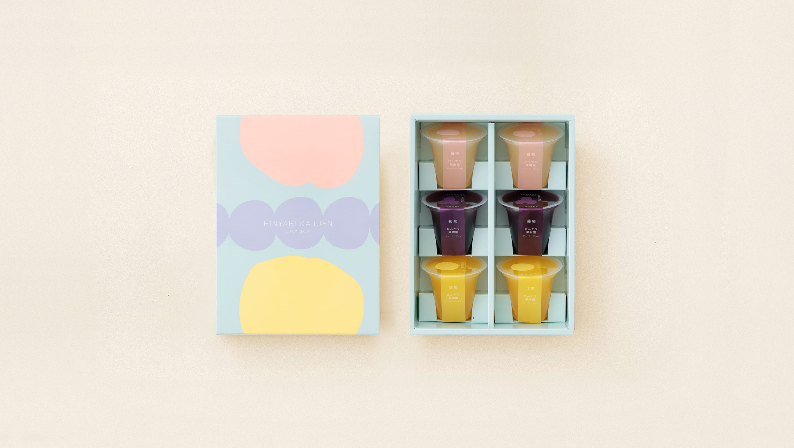 - 岡山県産清水白桃と山梨県産白桃果汁のとろける味わい“白桃”、濃厚な果汁に岡山県産キャンベルピューレ・ピオーネを入れた芳醇な香りの”葡萄”、愛媛県産甘夏のすっきりとした酸味とほのかな苦味が心地よい爽やかな“甘夏”の3種類のジュレを詰め合わせました。